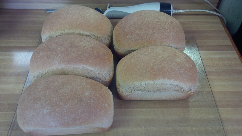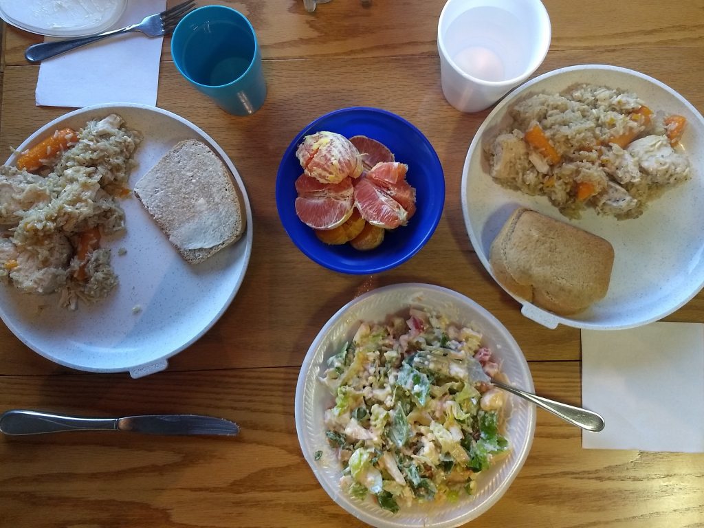Healthy meal of whole wheat, honey bread, brown rice and chicken, fruit, tossed salad and water
