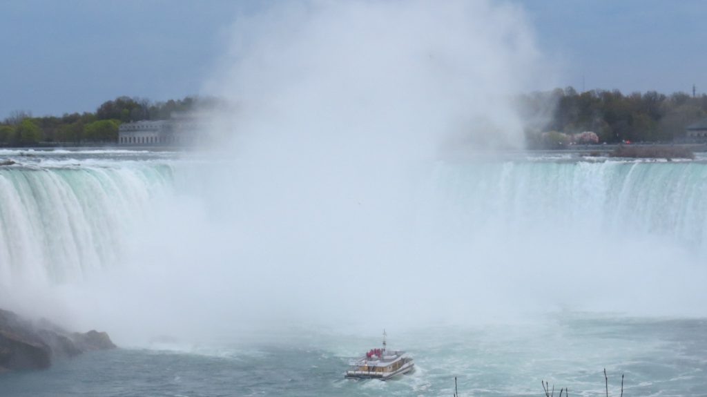 Boat with tourists at the base of the Falls