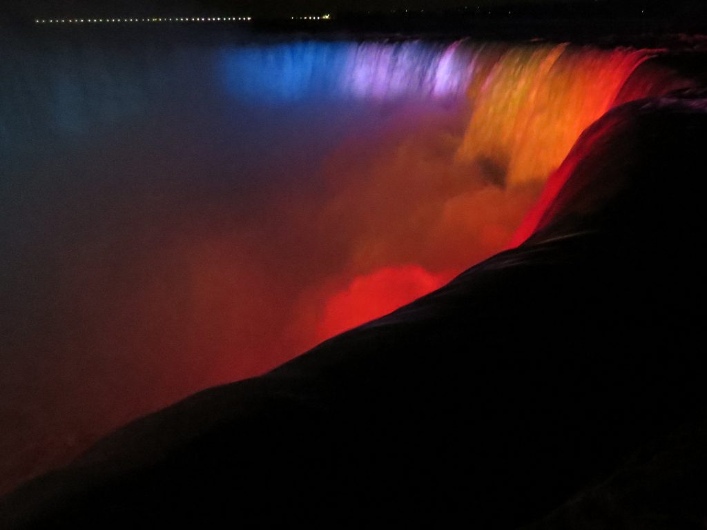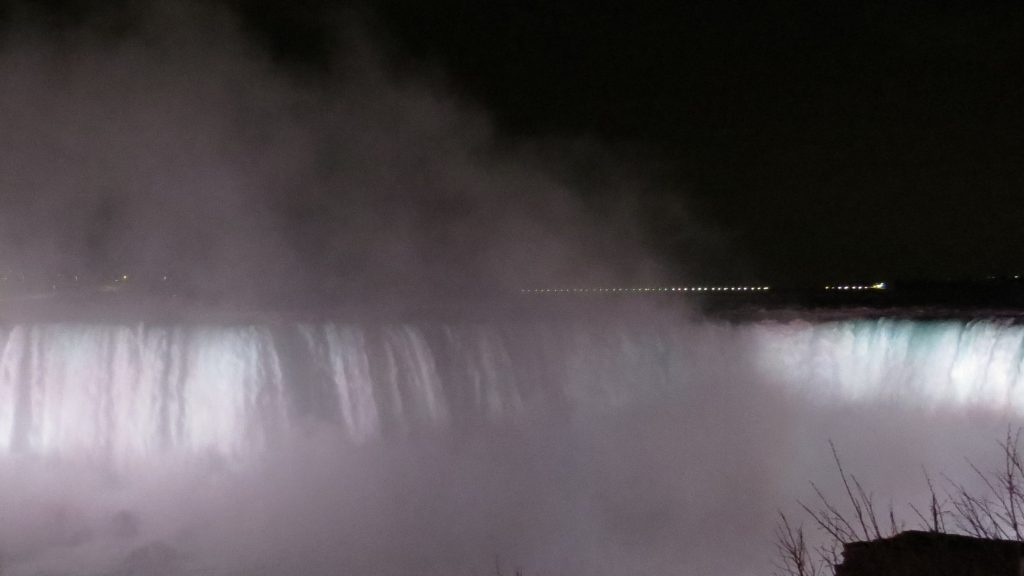 Dark rushing waters falling over the falls at night